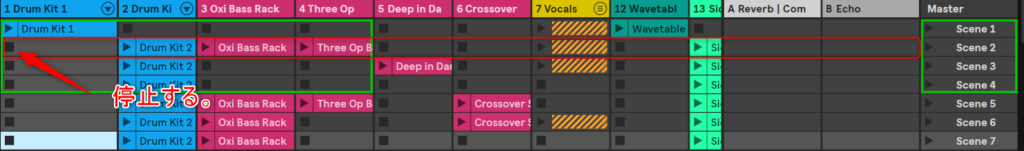 Scene2を再生したら、Drum Kit1は鳴らない。当然だよね。Scene2のDrum kit1は停止ボタンになっているからね。