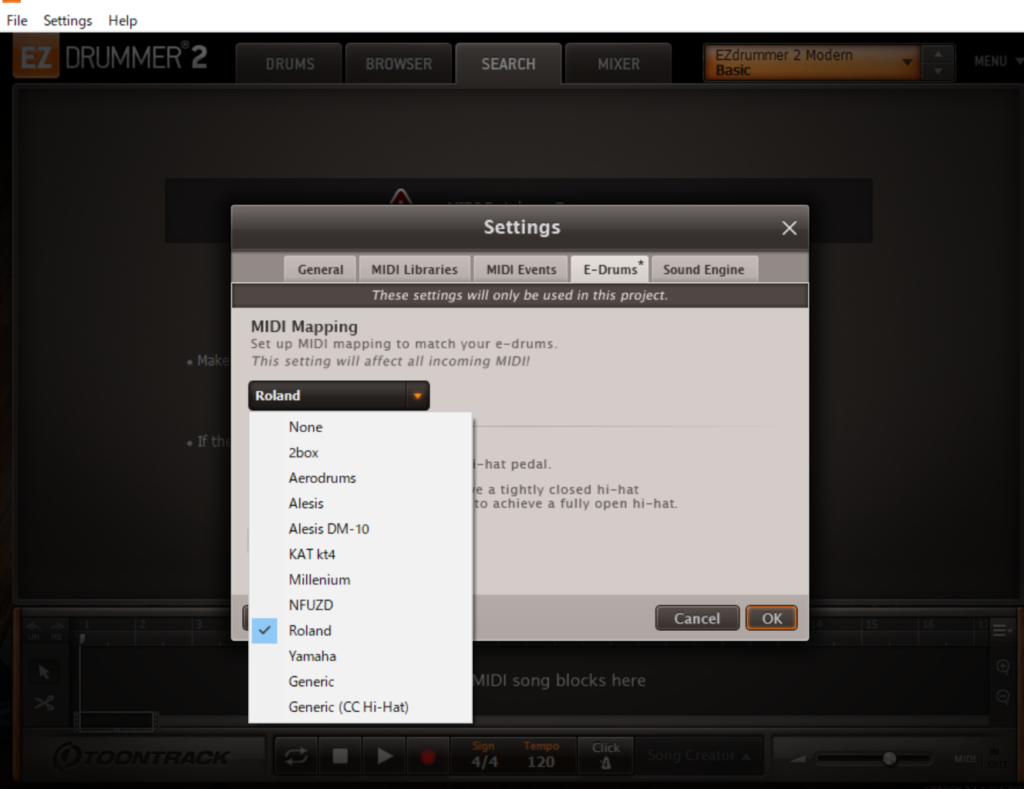 Settings→E-drums→Rolandと選択するだけ。今のドラム音源ならどれでもあると思います。面倒なMIDIマッピングは必要ないです。これで、カップやハイハット、リムなどの設定が反映されます。