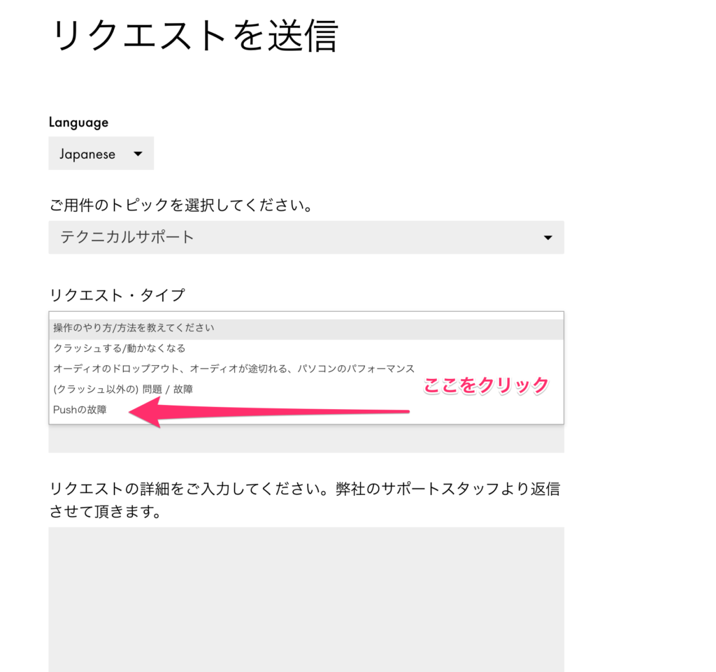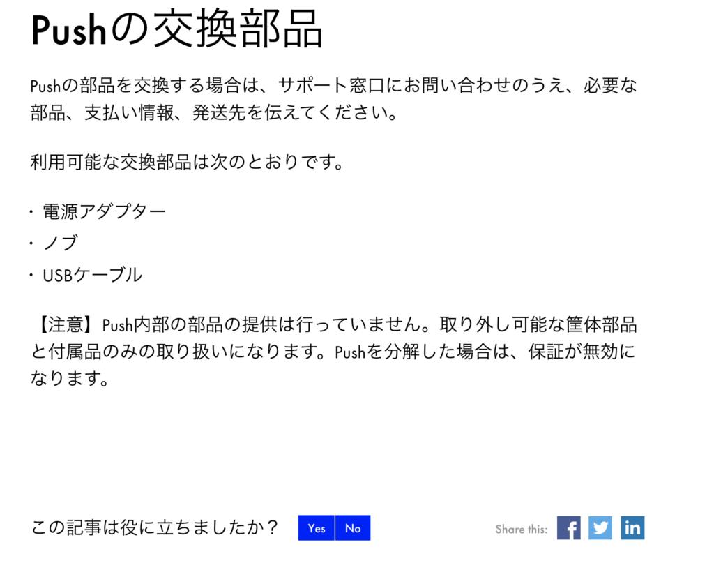 簡単に問い合わせできると安心だよね。今回はPUSHの修理なので、テクニカルサポートに連絡すればいいね。リンクはヘルプページに飛ぶようになってるからね。