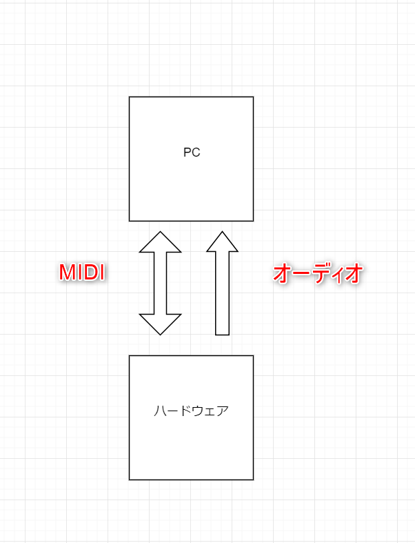 そして、PCからハードウェアにMIDIデータを送る必要がある。これがなんで必要かって言うと、一旦MIDIデータで録音したものを再生する時にいるよね。