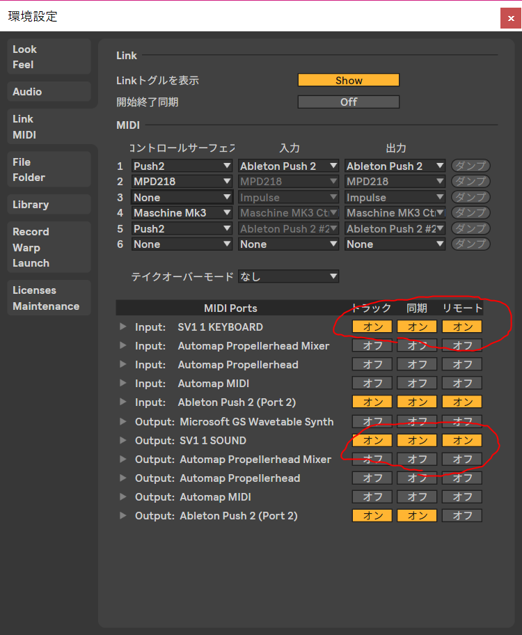 今回はSV-1をコントロールするということで、トラック、同期、リモートを設定する。面倒くさかったら全部オンにすればいいよ。