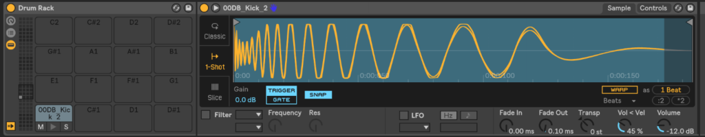 さっきと同じキックを使ってみようか00DB_Kick_2をクラッシュと一緒に鳴らすとする。チェインを使ってやります。サンプルドラッグしてみるよ。
