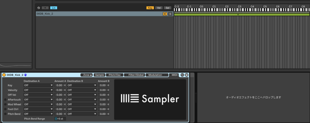 こういう画面になるはずや。ならんかったら、SamplerのZoneというところを押してね。