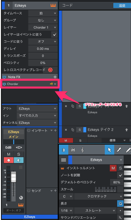 で、オーディオと違うのは、MIDIの場合はプリフェーダセンドでもポストフェーダーセンドのインストゥルメントに信号は送られる。でもプリフェーダーセンドにするとNoteFXで出力されたデータがMIDIトラックに記録される。