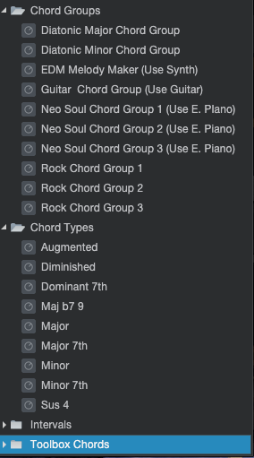 プリセットもなかなかそろってますね。ダイアトニック・コードなんかも入ってますし、EDMなんか作りたい人にはいいんじゃないでしょうか。Toolbox(Studio Oneの有料アドオン)なんか購入するとかなり拡張されます。