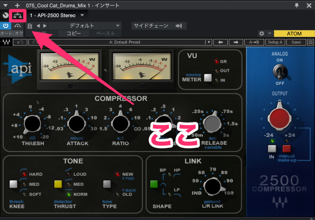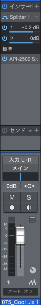ミキサー全体の視認性がいいのはStudio Oneの特徴ですが、ミキサー画面見ながら、信号量が把握できます。全体のサウンド聞きながら、もうちょっとアタック戻したいなと言うときなんかもに簡単に調節出来ます。