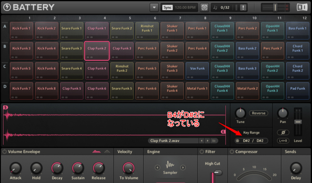 B4を見てください。これがD#2なっているということは、PADの1番は音程で言えばC1、BatteryのA1が対応するものですね。