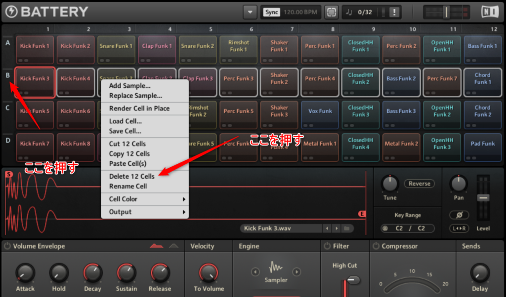 Battery、パッドで鳴らしたい音を交換したい場合は、セルを選択してドラッグアンドドロップすれば入れ替わります。