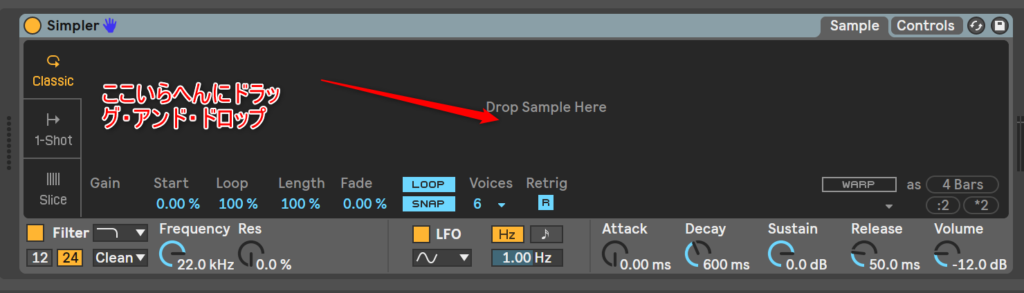 基本的に、サンプルを加工する場合はSimplerというAbleton Liveのサンプラーを使って読み込みます。