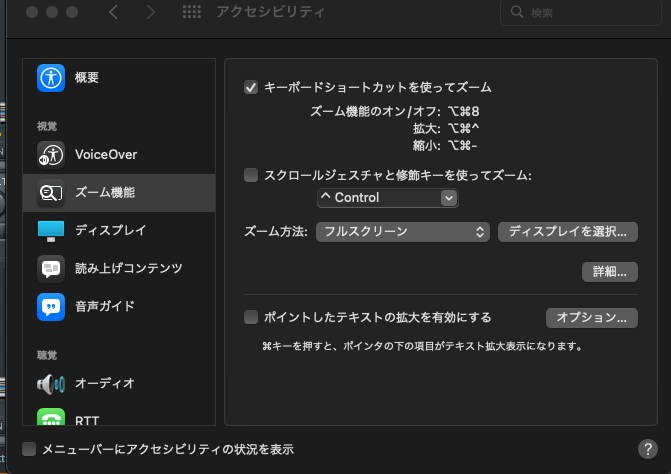 をクリックしてから、右側の「ズーム機能」をクリックします。(下にスクロールする必要がある場合があります。) - 「キーボードショートカットを使ってズーム」をオンにします。