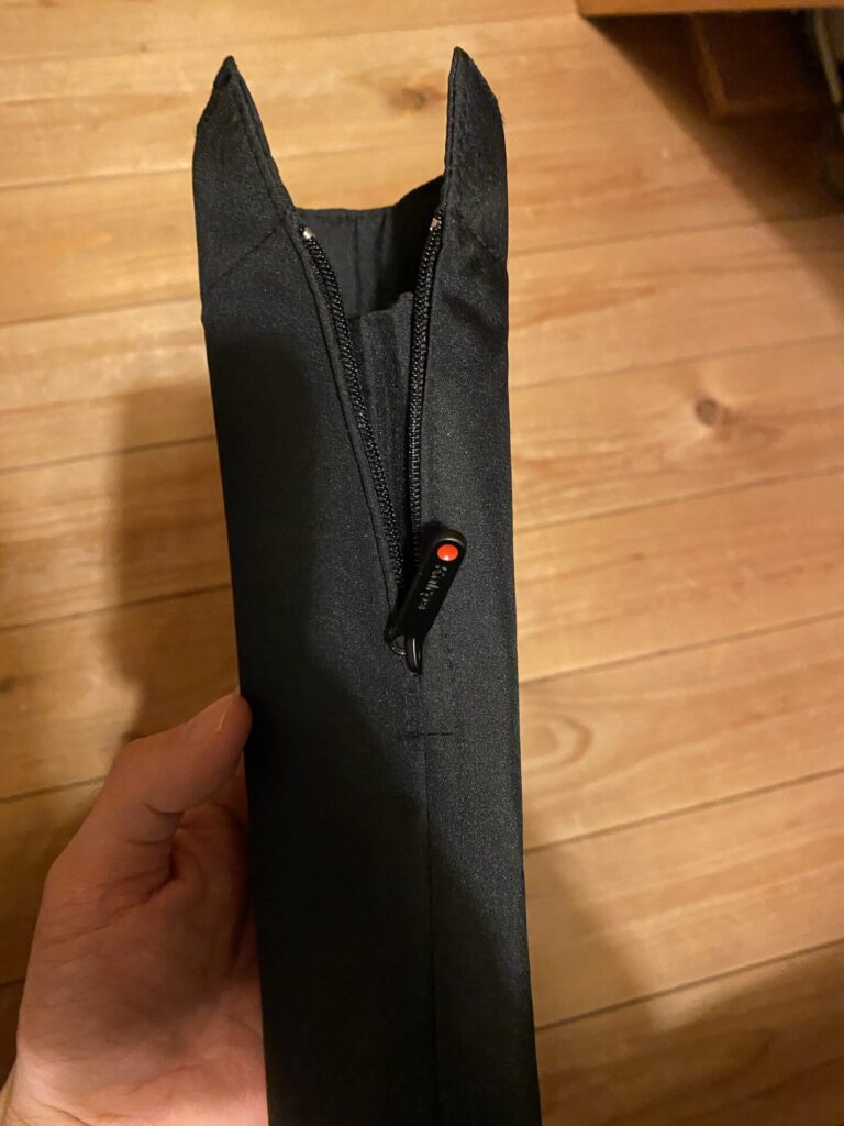 ジッパーが付いてるんです。よくある伸縮式のものに比べると、ジッパー下げたら入れるのも出すのも簡単です。他にも良いと思う折りたたみ傘もあったんですが、濡れない。雨が降ってからすぐさせる、しまえるという観点では私にとっては最高ですね。