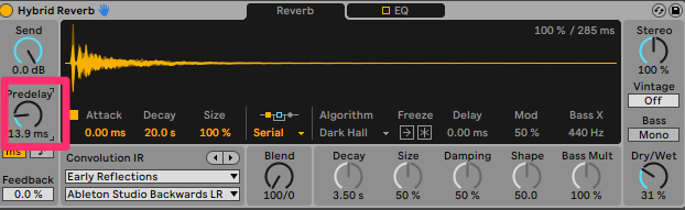 AbletonだとHybrid RevrbなんかはConvolution Reverbでプレート・リバーブもスプリング・リバーブも選ぶことが出来て、Predelayも変更できます。