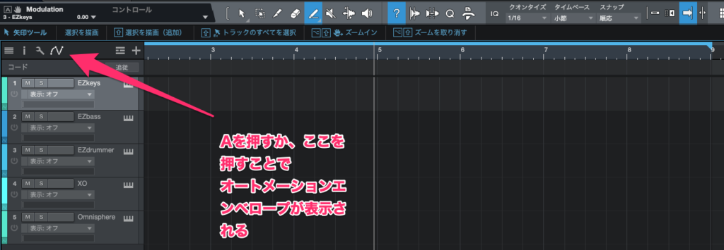 Aキーを押せば、オートメーションエンベロープが表示されるのは同じです。が、マスタートラックのエンベロープが表示されません。