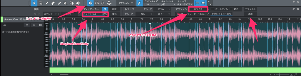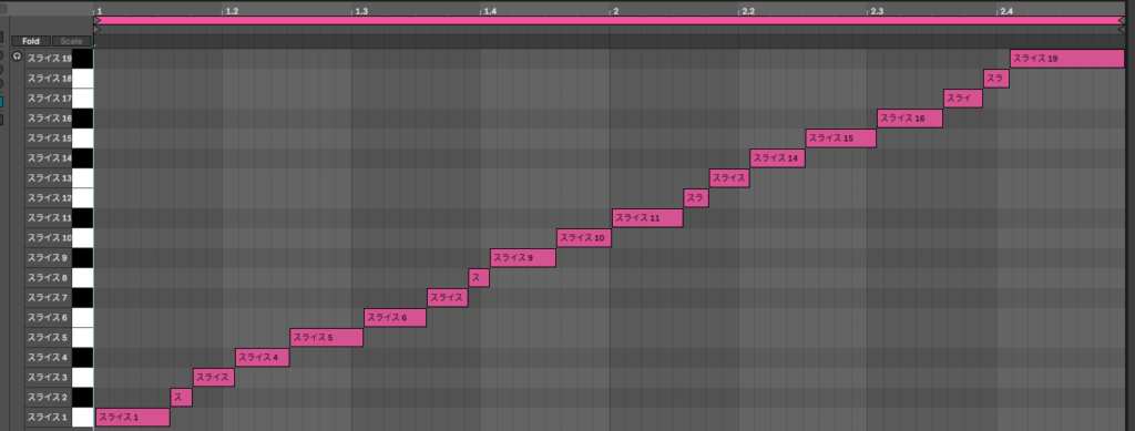 今回は、ドラムのループをスライスしたので自動検出させましたが、もちろん手動で切っても構いません。