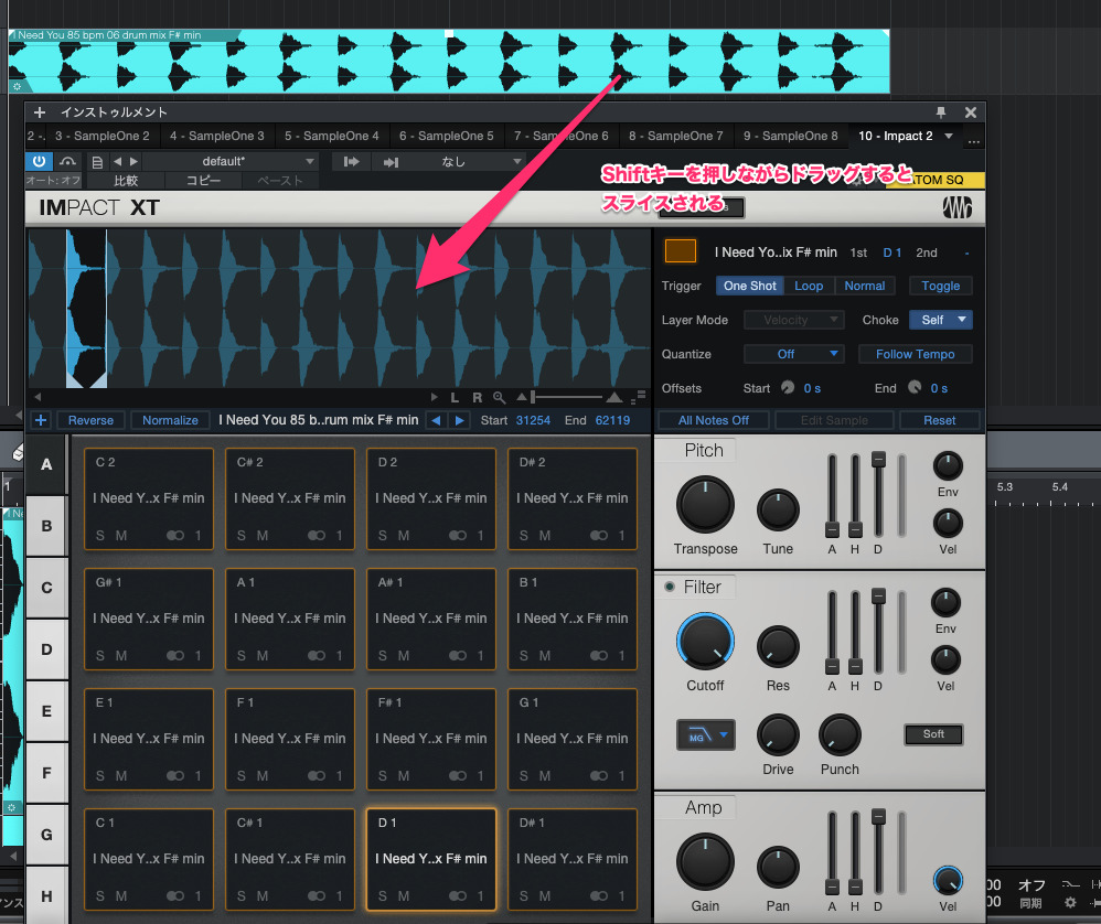注意点としては「新規SampleOneに送信」「新規Impactに送信」でスライスされたデータがSample One XTに読み込まれはするんですが、そのままだとスライスされてないデータが送られてしまいます。