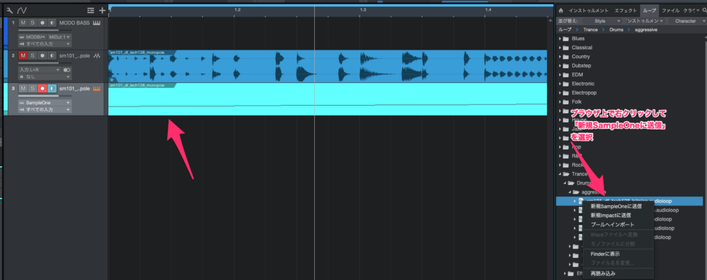 Abletonだと右クリックしてから簡単に出力できますが、Studio Oneの場合はひと手間掛ける必要があります…