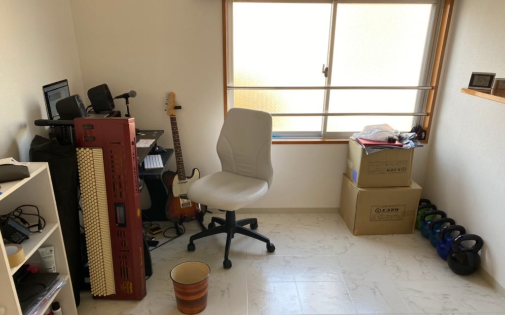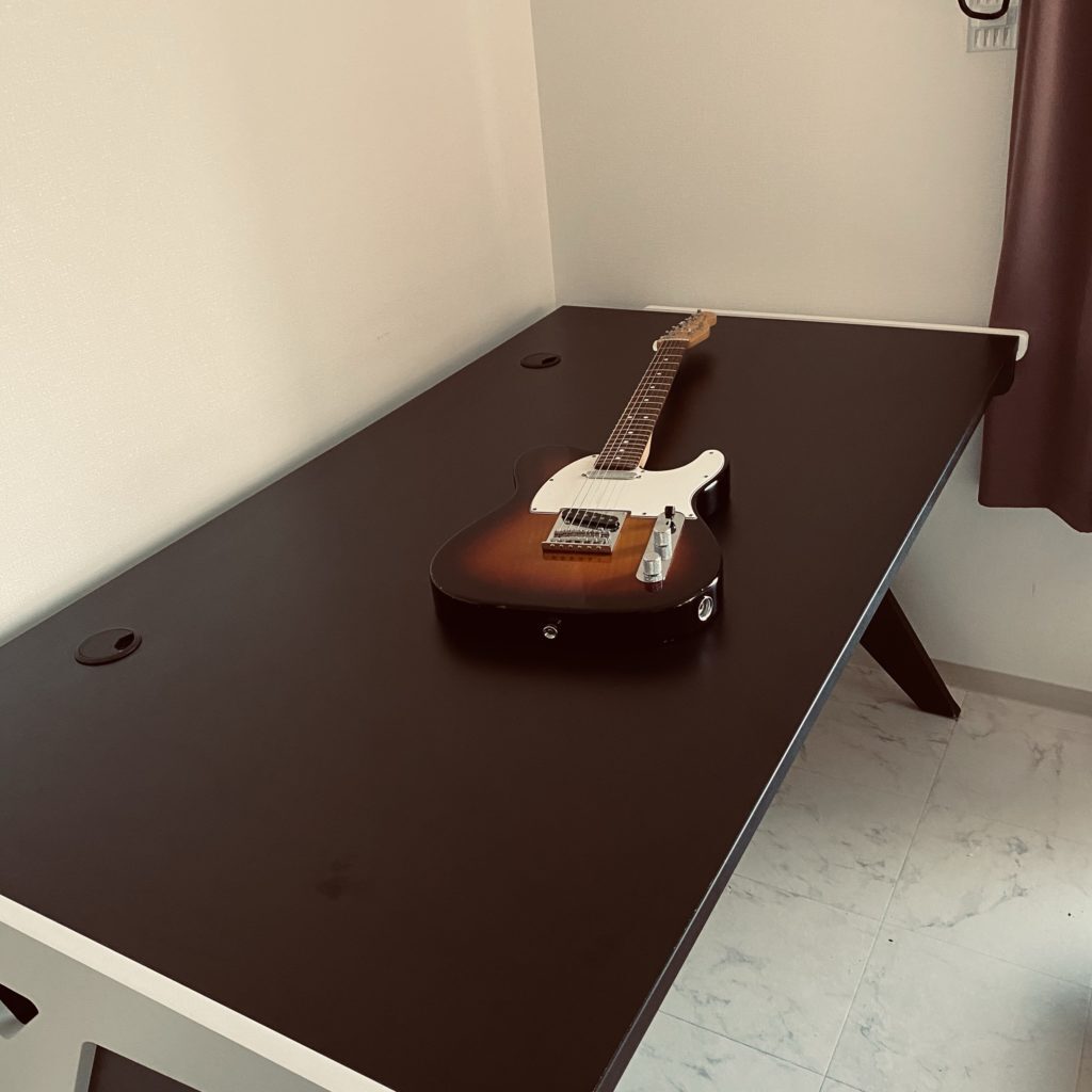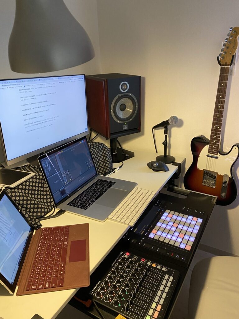 ギターが最低限弾ければいいという機材選択です。ホテル暮らしが今まで結構長かったので、狭いデスクでも仕事や音楽を続けることはうまく出来ると思っていました。