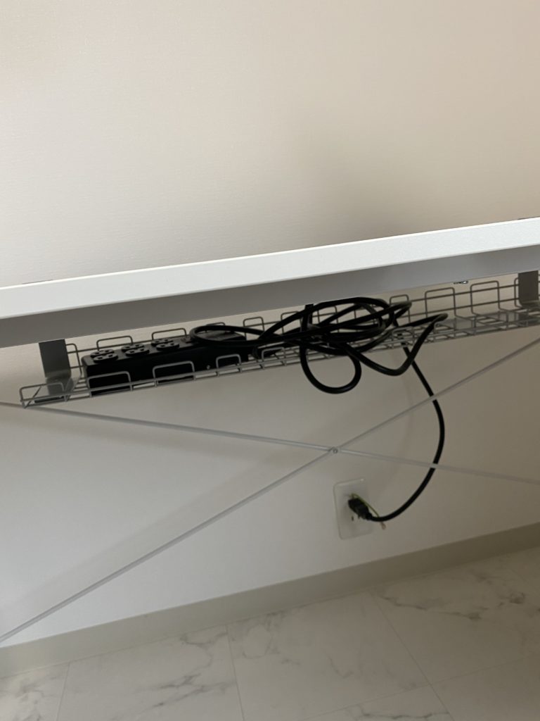 机の下に、ケーブル類などが収納できるようになっている。ケーブル出せるところがあるので、デスクを美しくしたい人にはいいと思う。