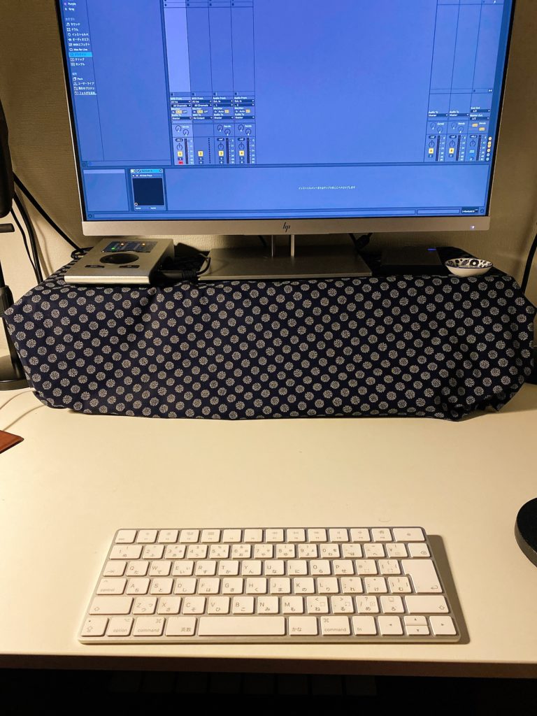 画面共有するときにMacBookを出せばいいと考え、ハブやSSDを見えないように卓上台に布を掛けました。