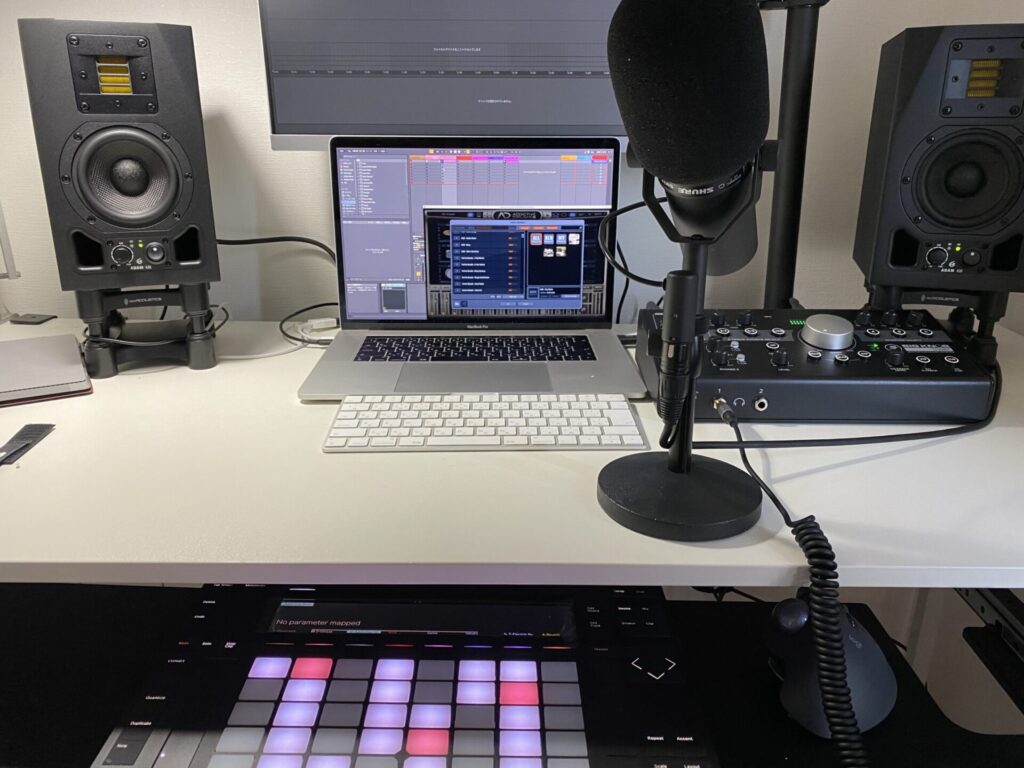 Mac,PUSH2,オーディオインターフェース、NektarPACER,ギター、Wholetone Revolution、Microkey、ヘッドフォン、iLoud Micro Monitorというミニマルなセットアップです。