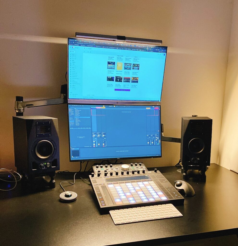 で、ディスプレイ2枚を当初は横置きにしてたんですけど、視線移動も大きいし、モニタースピーカーの位置が定まらない。