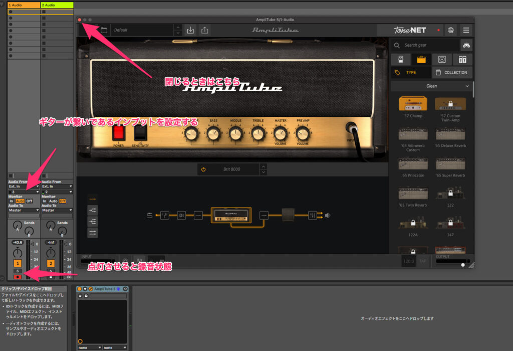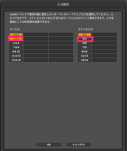 ギターはモノラルなのでモノ入力の3&4をクリック。ハードのシンセなどステレオ出力の機材をつなぐ場合はステレオ入力3/4を選択しておくといいと思います。