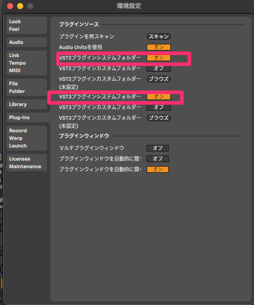 特にVSTプラグインをインストールするフォルダを指定していない場合、プラグインシステムフォルダーというところにインストールされているはずですので、そちらをオンにしてください。