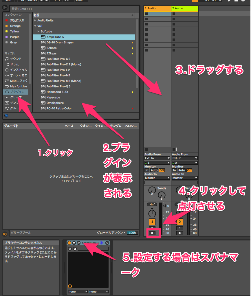 VSTプラグイン街インストールされていれば、「プラグイン」というところに表示されますので、以下の手順でAudioトラックにドラッグしてください。